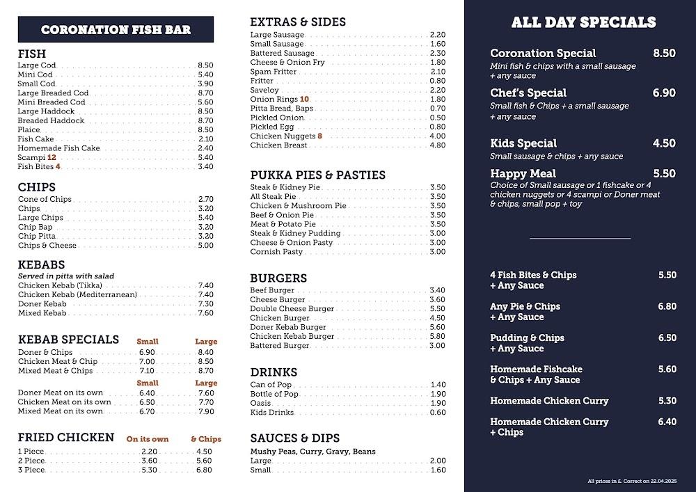 Located at 12 Coronation Street in Crewe, Coronation Fish Bar is a fast food staple that has served the community for years. The welcoming atmosphere and attentive staff set the tone for a delightful experience. No matter the time of day, the aroma of freshly cooked fish greets you at the door, hinting at the deliciousness waiting within. The casual ambiance makes it perfect for solo diners or families looking for a quick meal. Takeaway options are popular here, offering convenience without compromising quality. The restaurant is well-connected and provides easy access with wheelchair-friendly facilities including an entrance, seating, and toilets. Whether you are popping in for a quick bite or picking up dinner for the family, Coronation Fish Bar serves as a reliable go-to spot for flavorful meals. Plus, with free street parking available nearby, visiting becomes even more convenient.